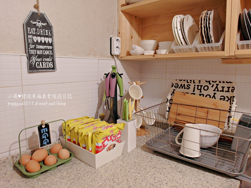 另一側的廚房櫃子則有很多鍋碗瓢盆、以及韓國泡麵、雞蛋、吐司!