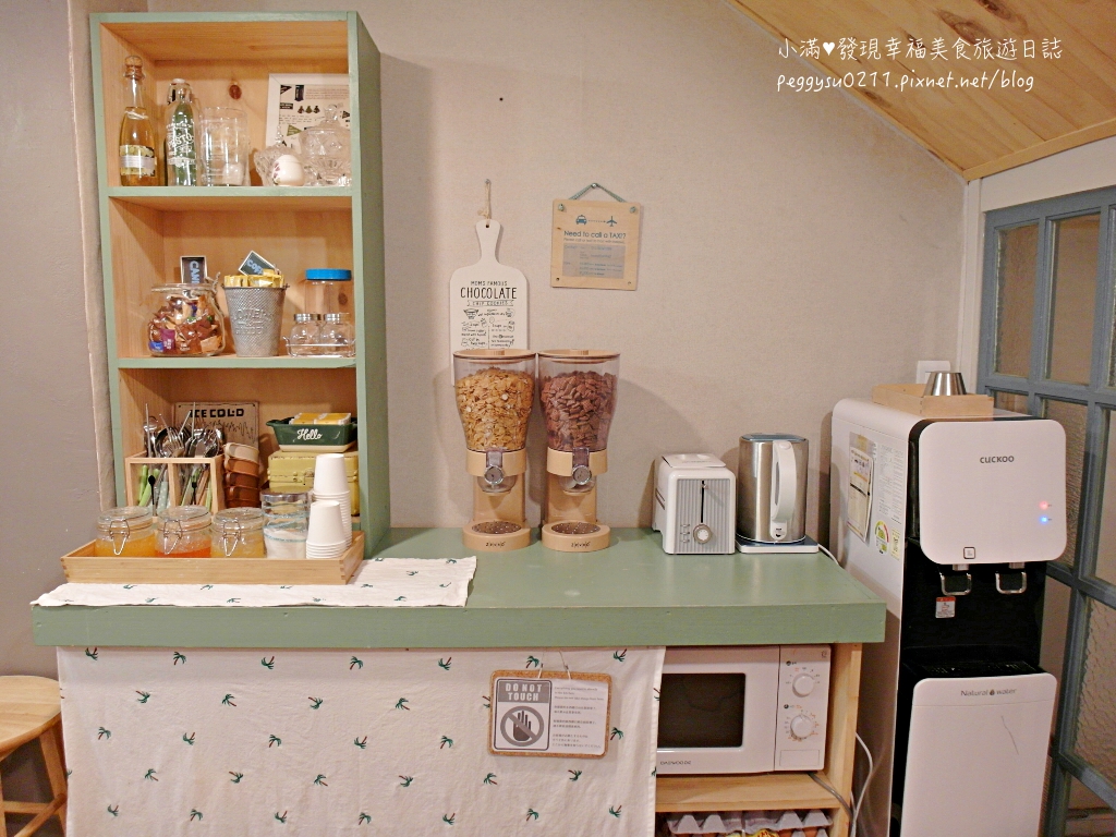 接待大廳裡面是開放式小廚房,有飲水機、烤麵包機、茶包、柚子茶果醬