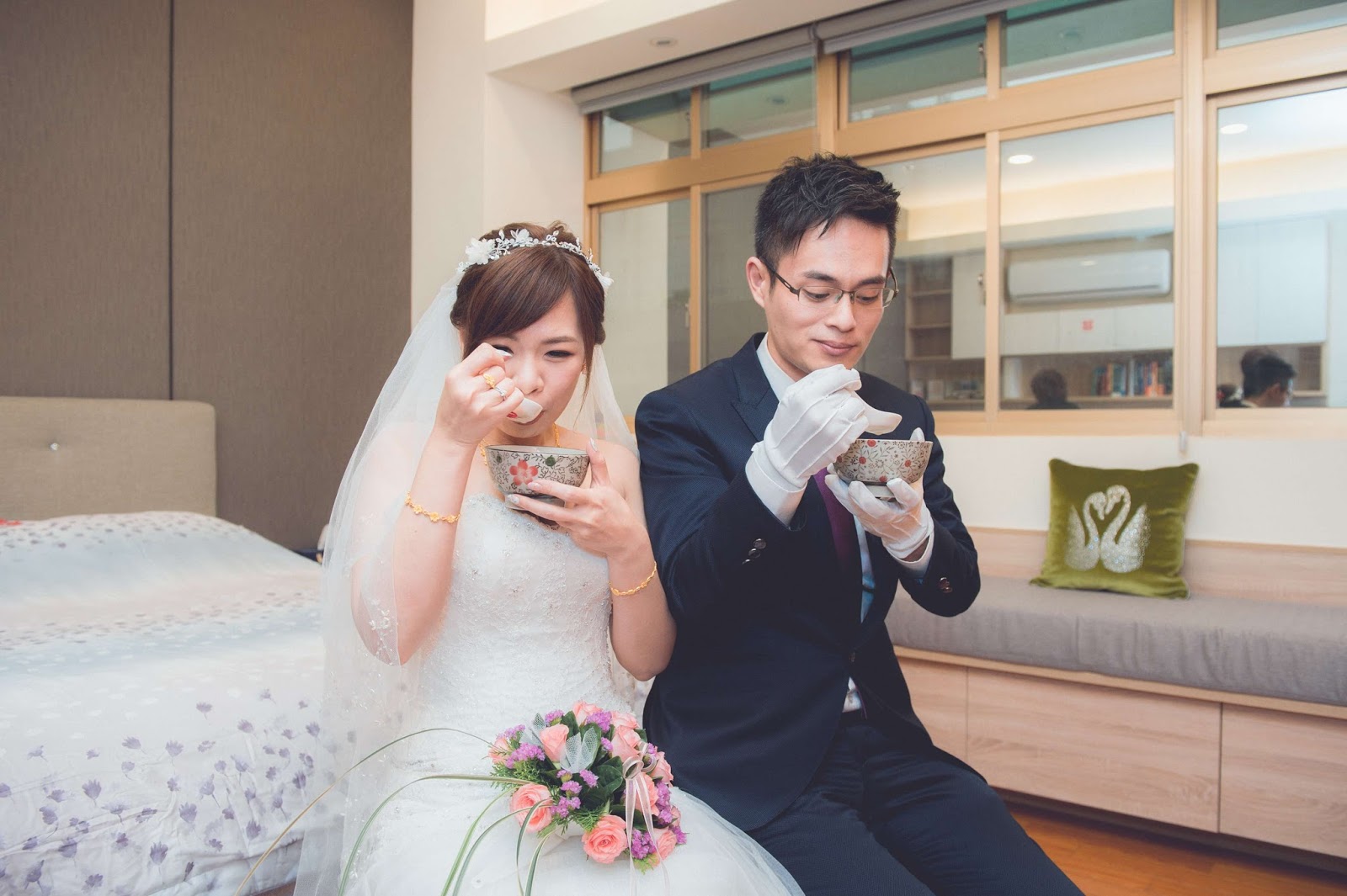 Honey幫我掀起頭紗後,接著由男方的女長輩盛甜湯進新房給新人