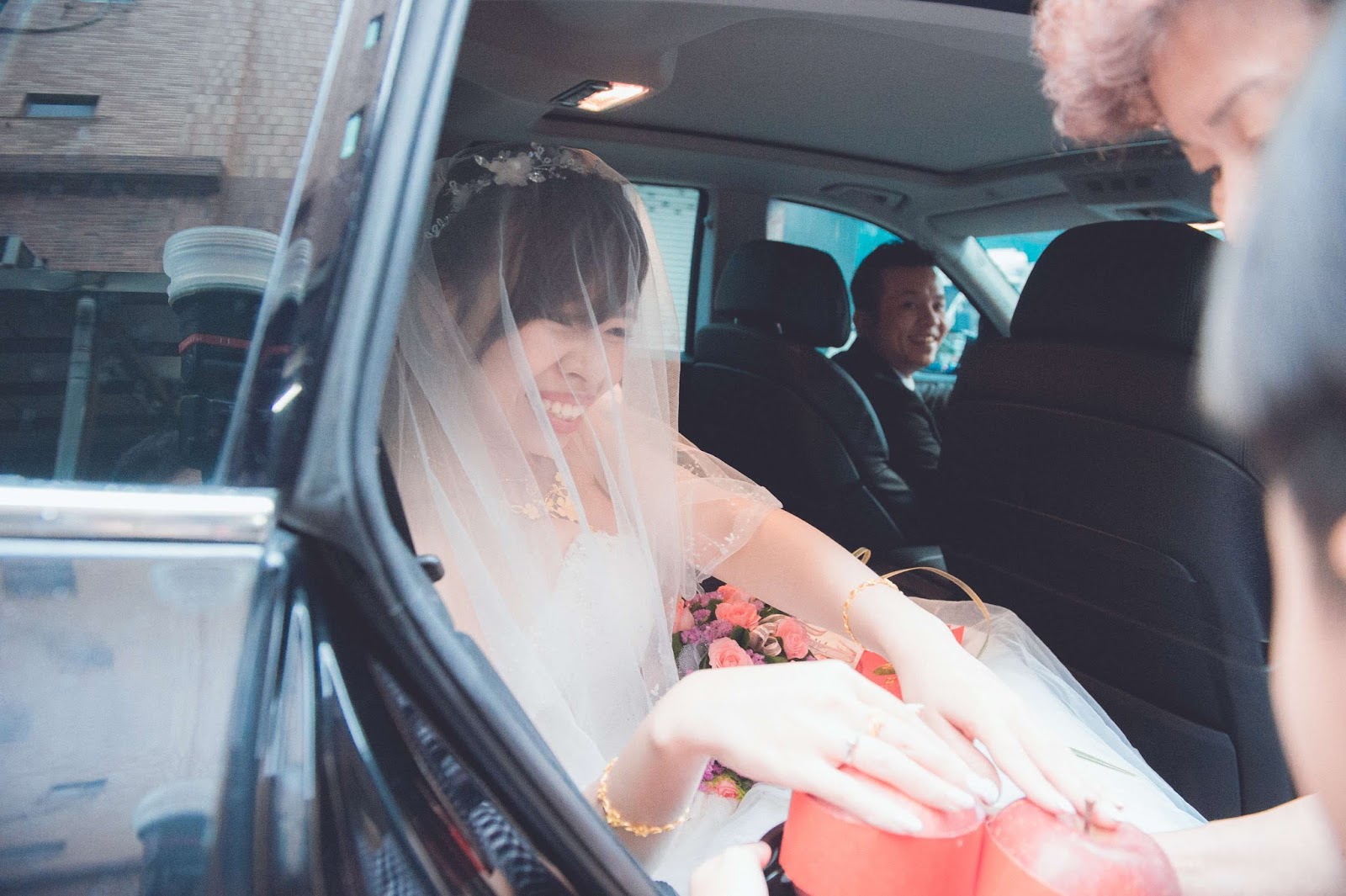 終於終於~男方迎娶隊伍的鞭炮再次鳴放,Honey拿著捧花下車來接我