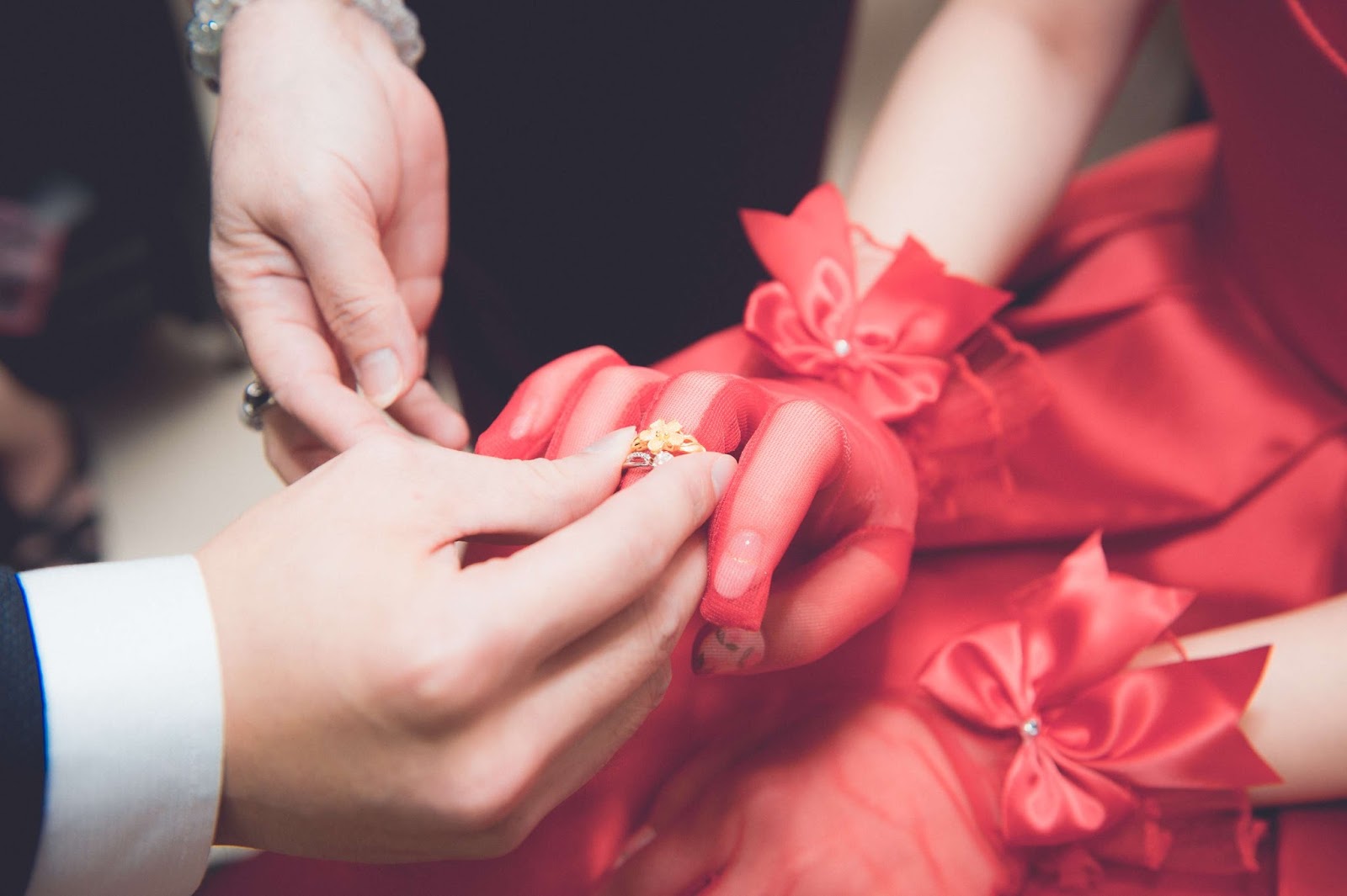 傳統上會用紅線綁金戒跟銅戒,代表永結同(銅)心(金),不過現在多省略銅戒