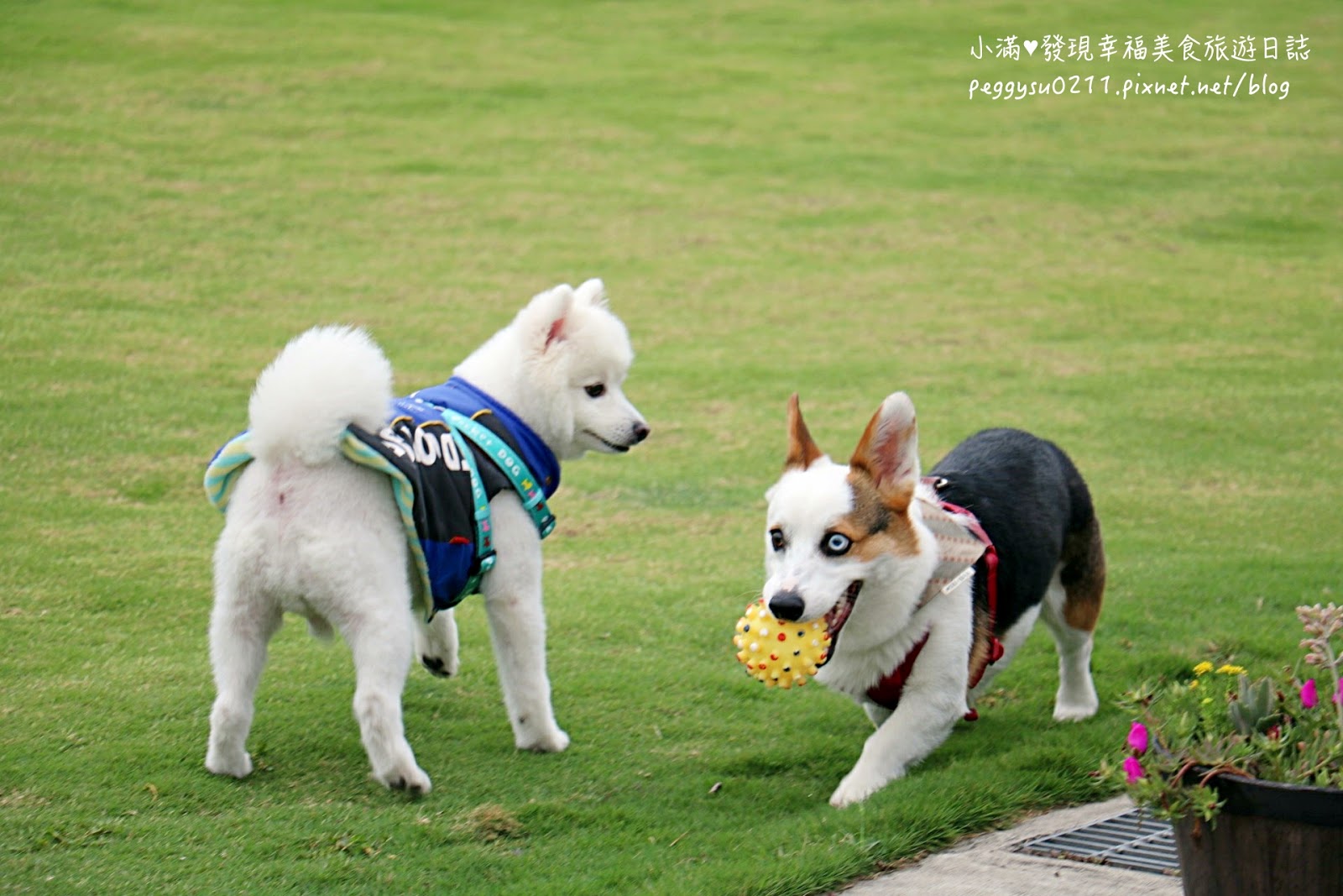 兩隻小狗一起玩丟球,超開心的~