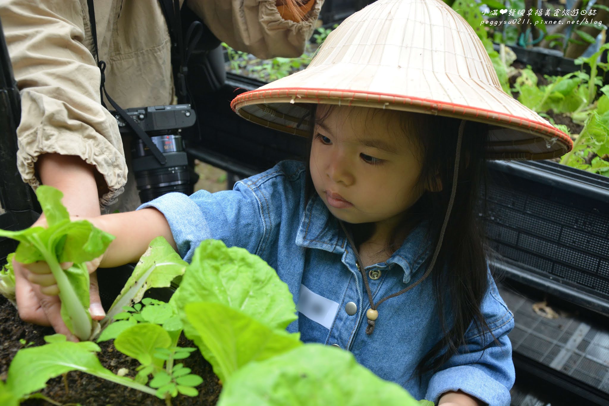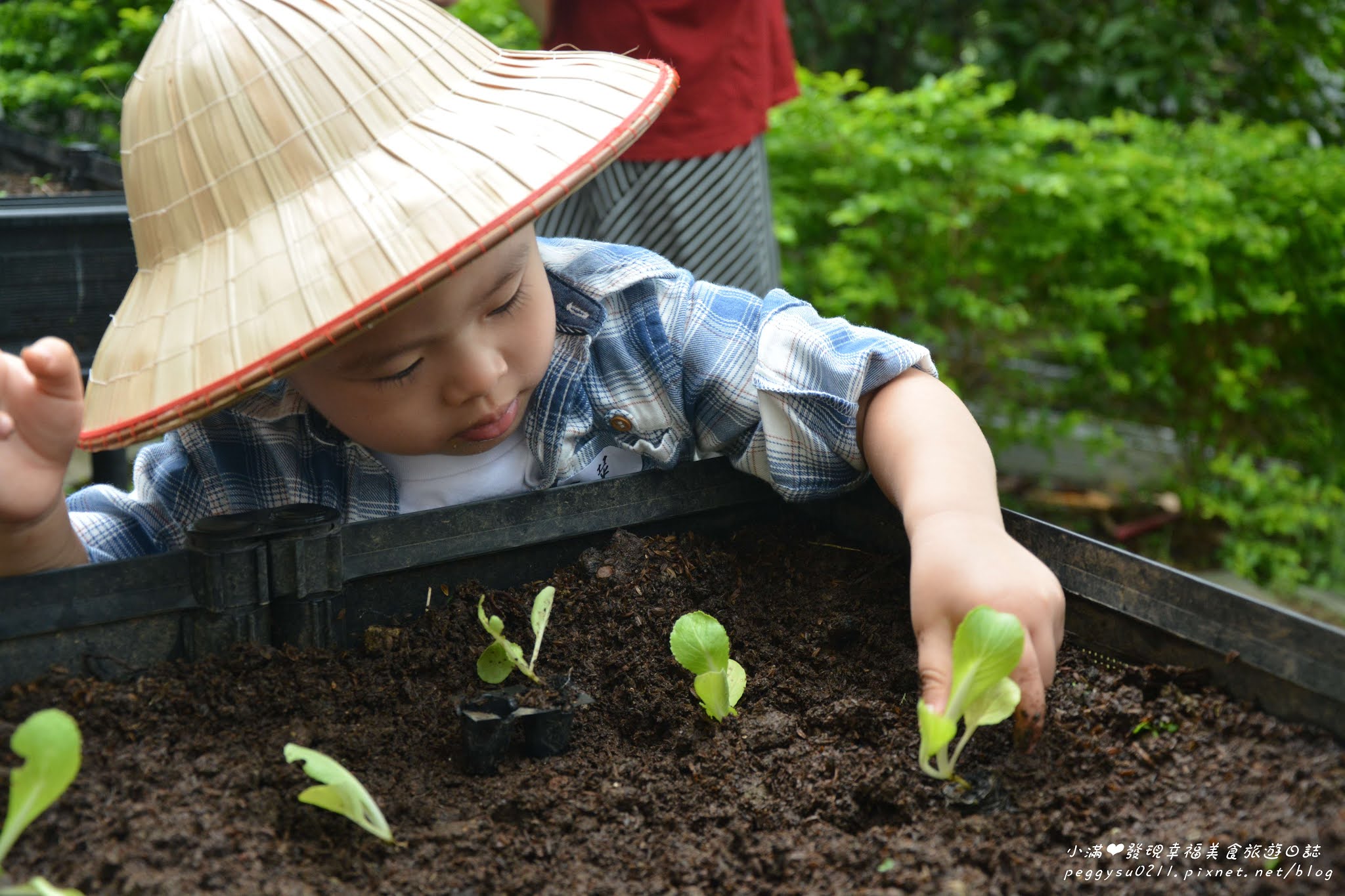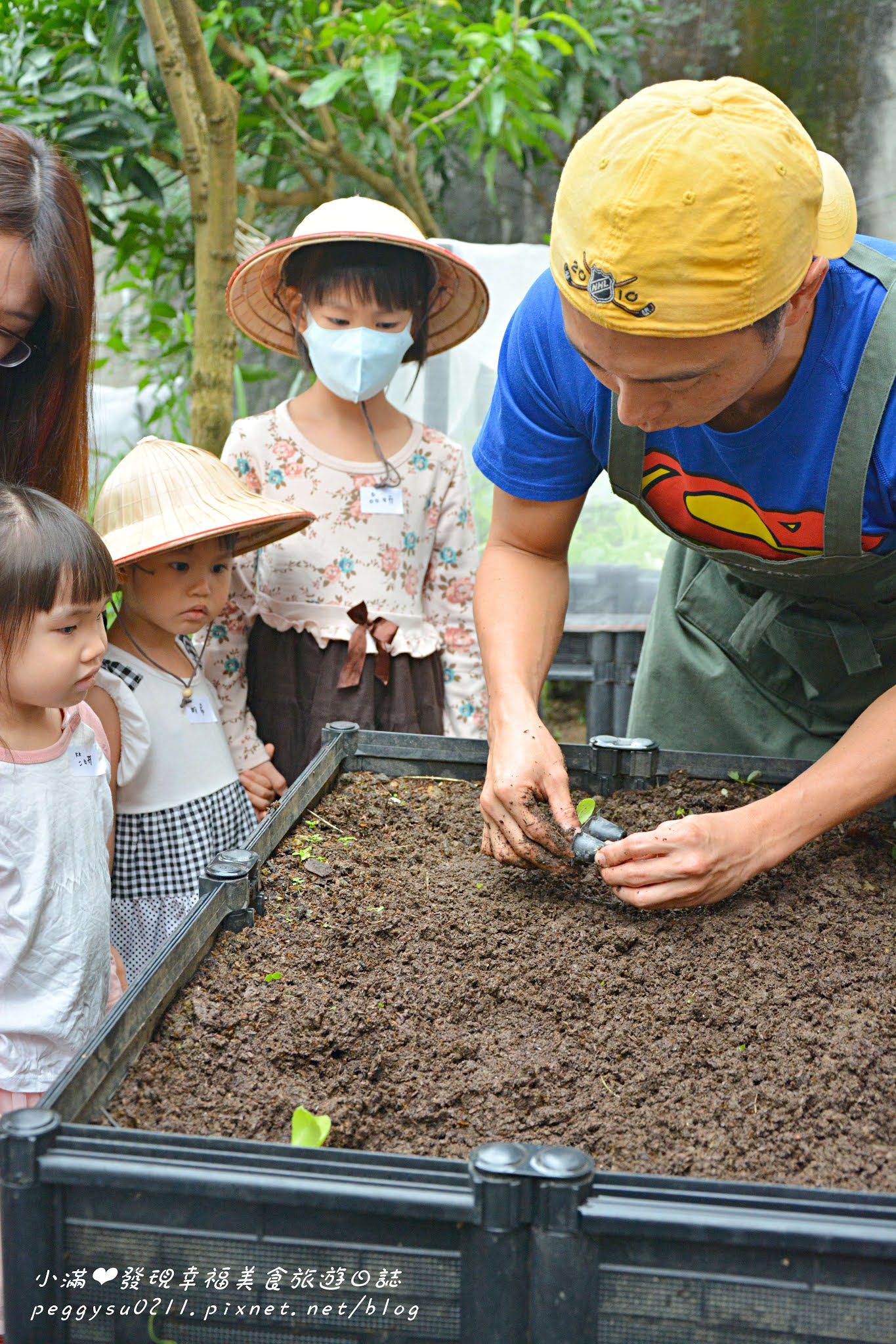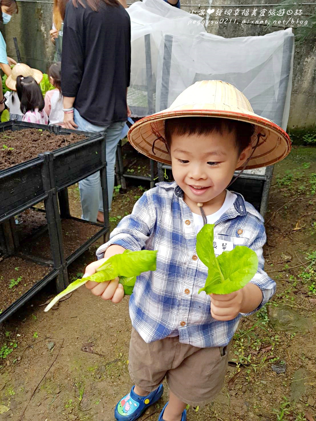 寶貝們戴上可愛的斗笠,要進行第一個活動:種青菜!