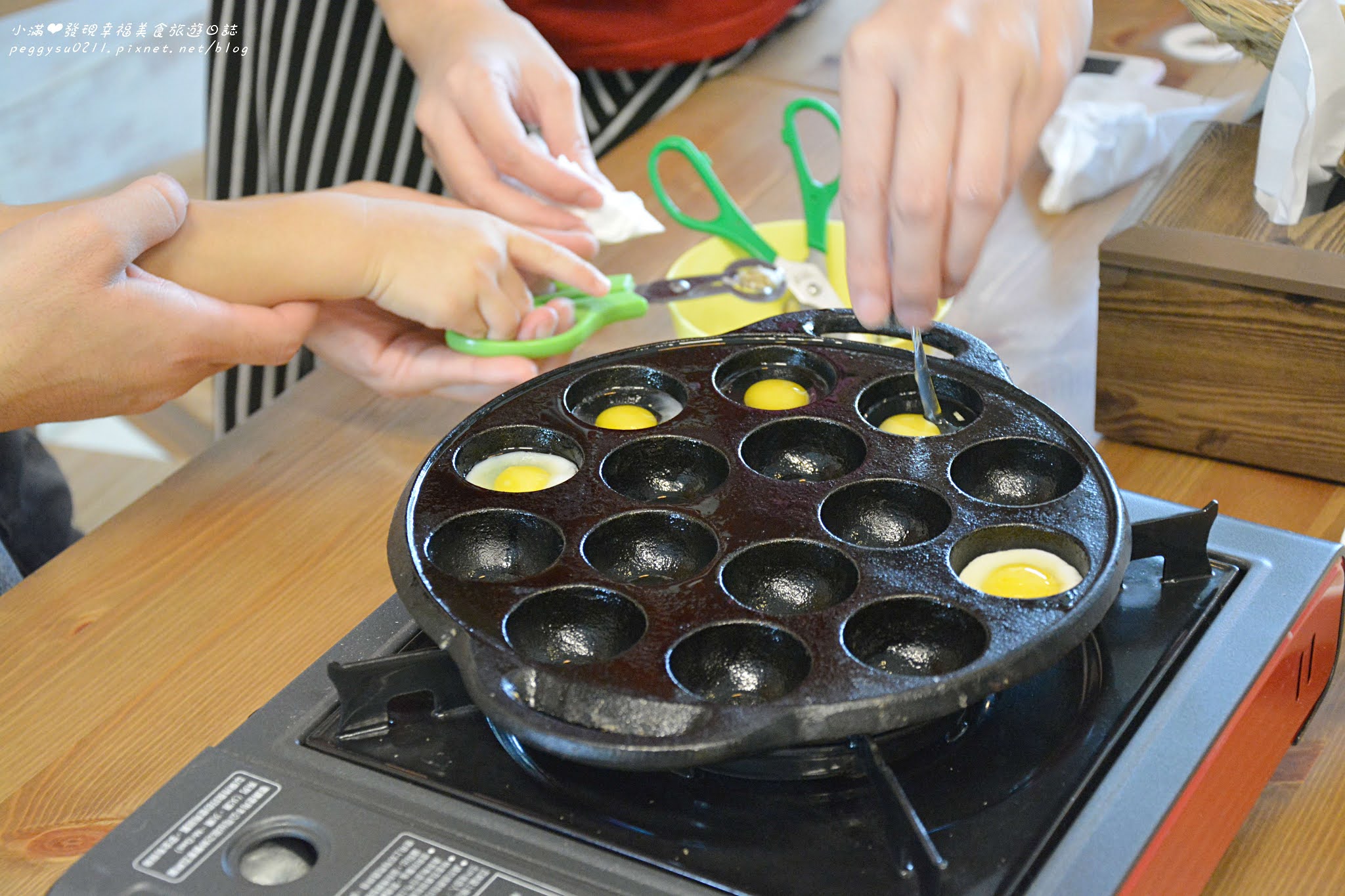 孩子們興奮的看著鳥蛋被煎熟,爸媽手忙腳亂地將鳥蛋翻面,相當有趣的體驗